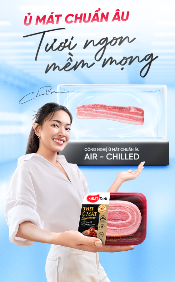 Thịt ủ mát MEATDeli từ nguồn heo/ gà khỏe, sản xuất theo Công nghệ ủ mát chuẩn Âu air-chilled, thịt được ủ mát từ bề mặt, đến tận sâu bên trong làm mềm từng thớ thịt, giúp thịt luôn tươi ngon, mềm mọng